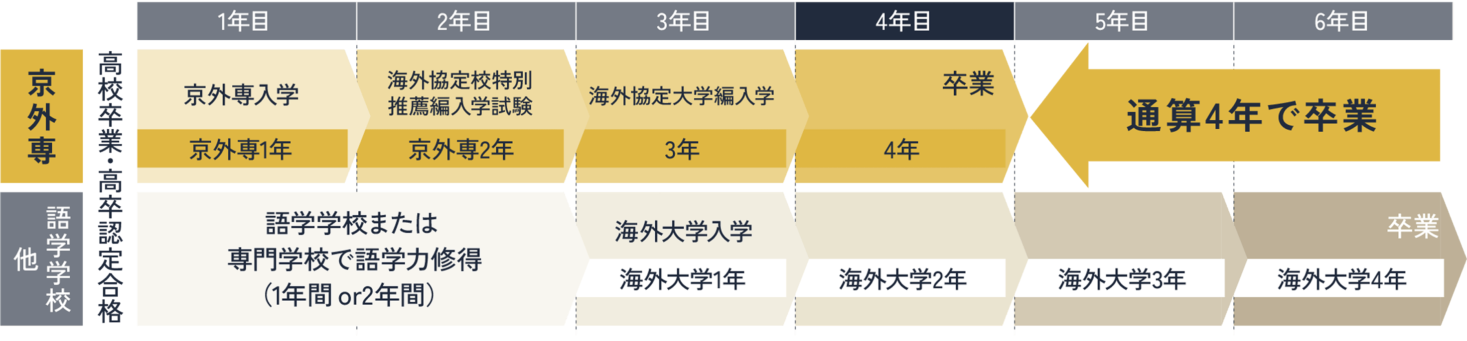 協定校の「特別推薦枠」などを使って海外の大学へ3年次(または2年次)から編入できる制度です。