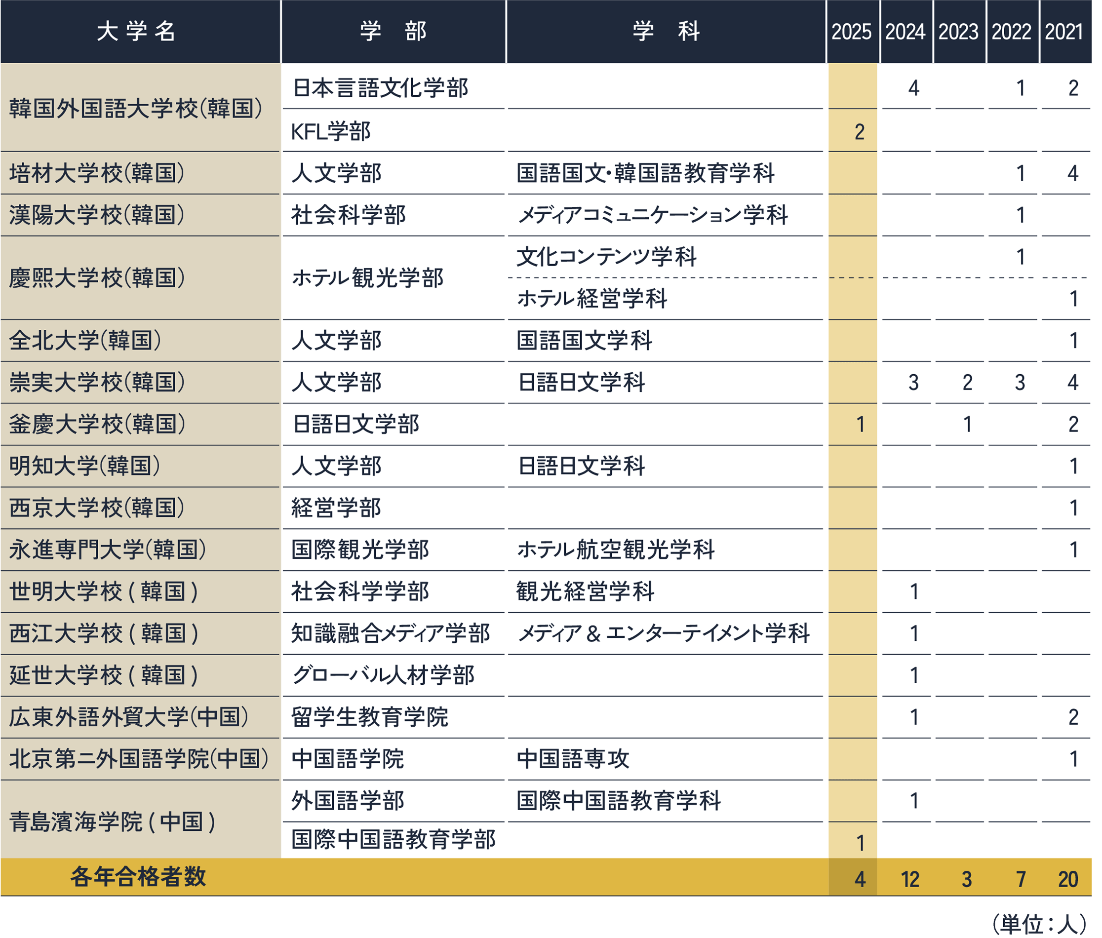 ※協定校:〈中国〉青島濱海学院/〈韓国〉永進専門大学校・世明大学校・培材大学校(各学期半年間、各校2名)