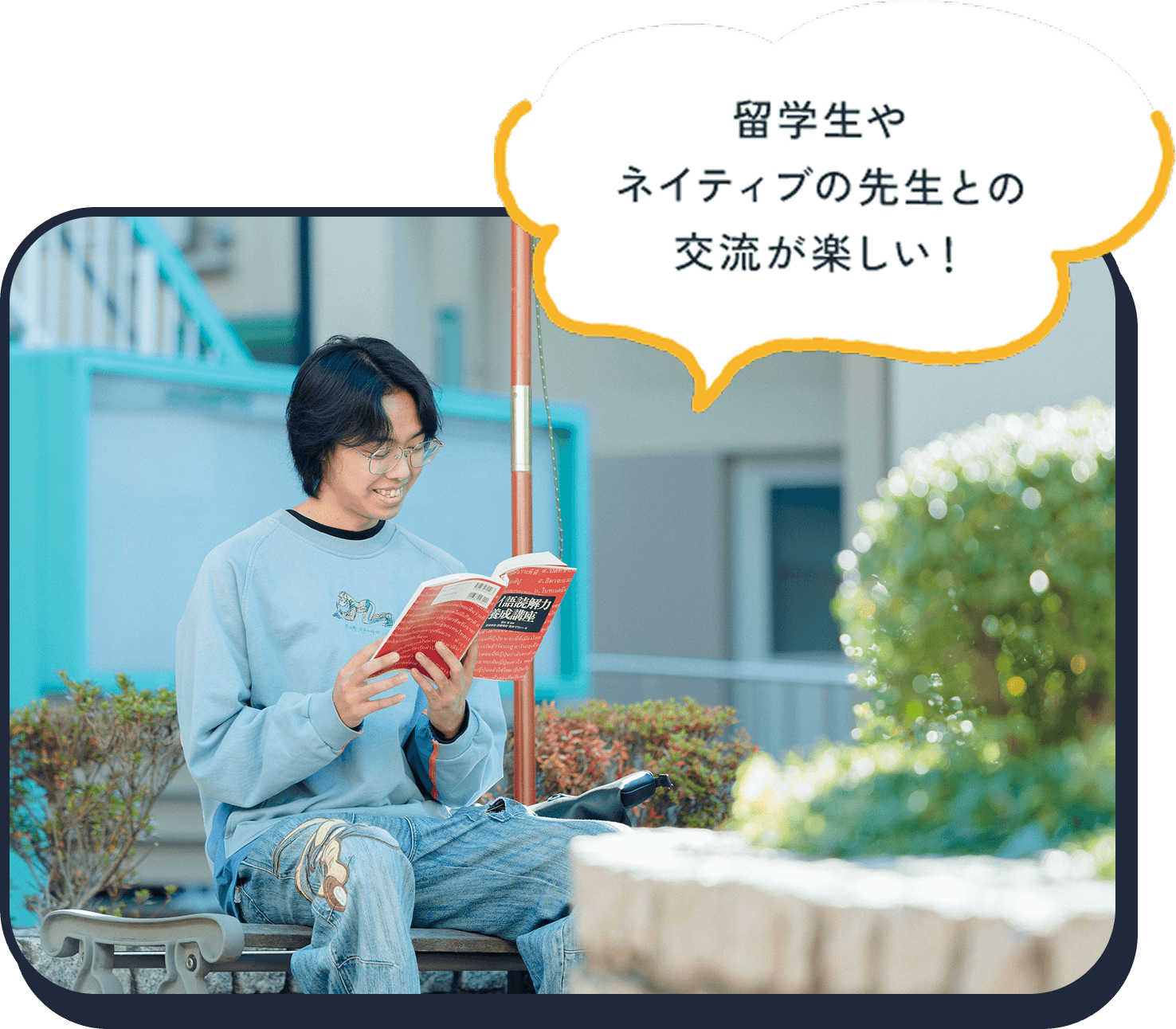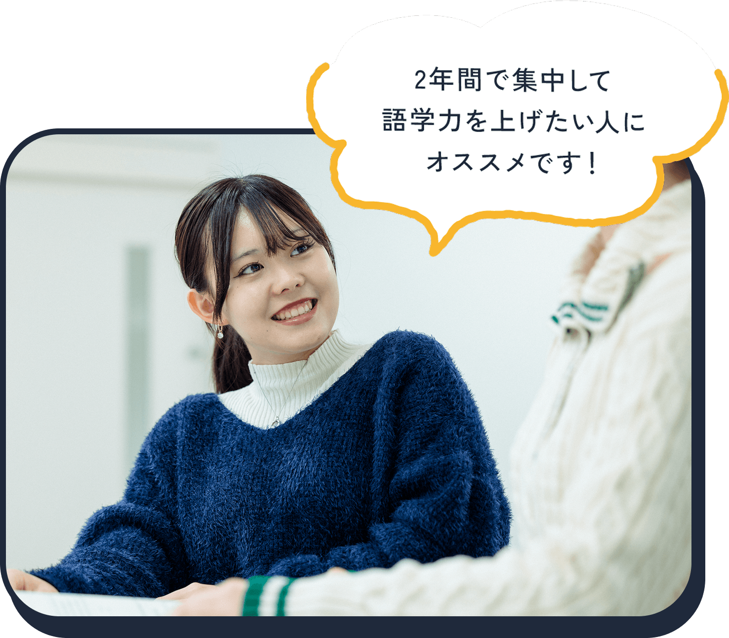 学科を超えた友達作りや外国人学生との交流も楽しく、先生との距離も近いので、2年間で集中して語学を磨きたい人に最適です。