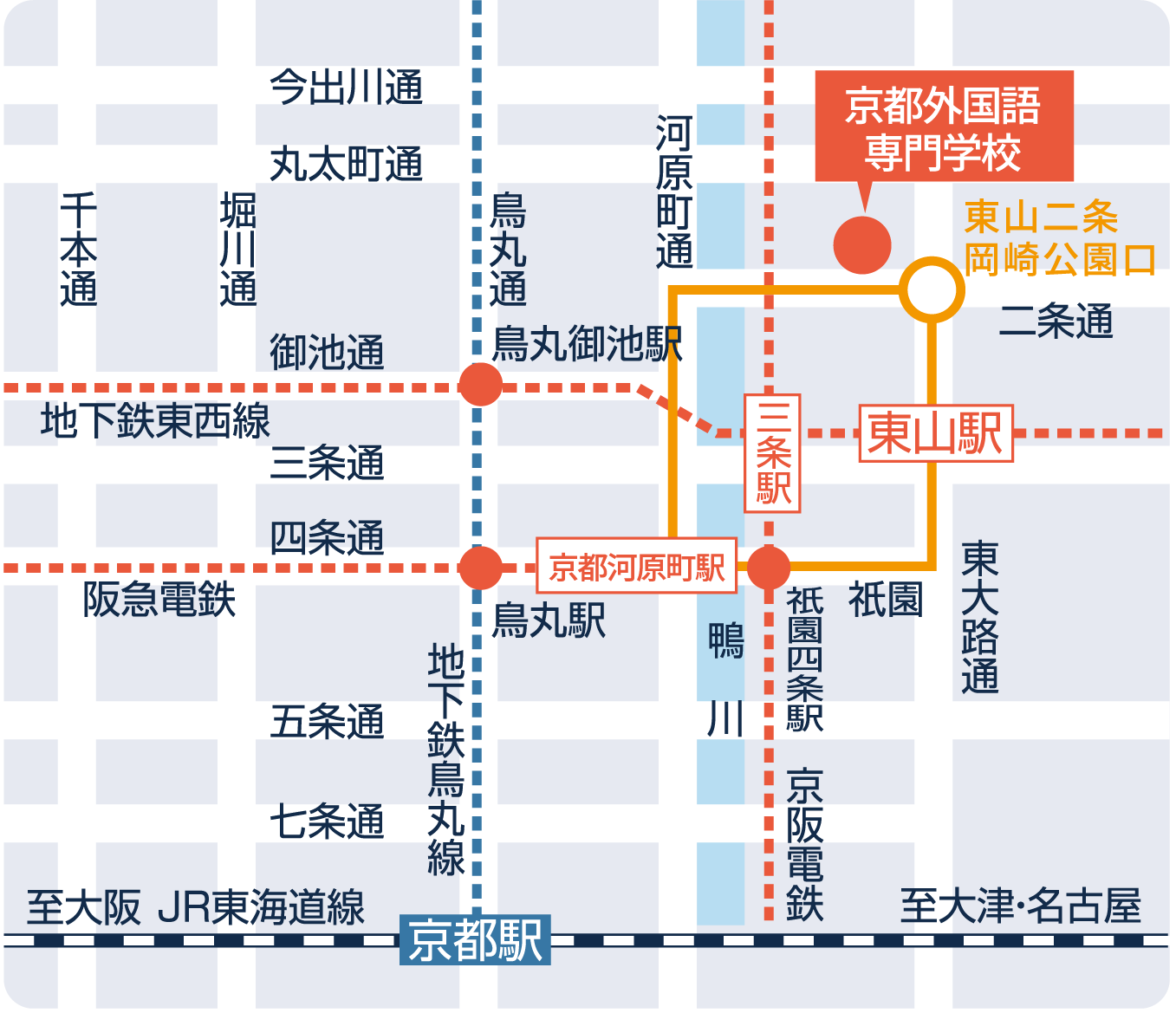 京外専は平安神宮や岡崎公園がある左京区の岡崎エリアにあります。哲学の道・南禅寺・八坂神社・清水寺など、京都を代表する歴史スポットもすぐ近く。三条や河原町といった買い物・食事スポットも徒歩圏内!京都の中心エリアだから、アクセスも便利です。